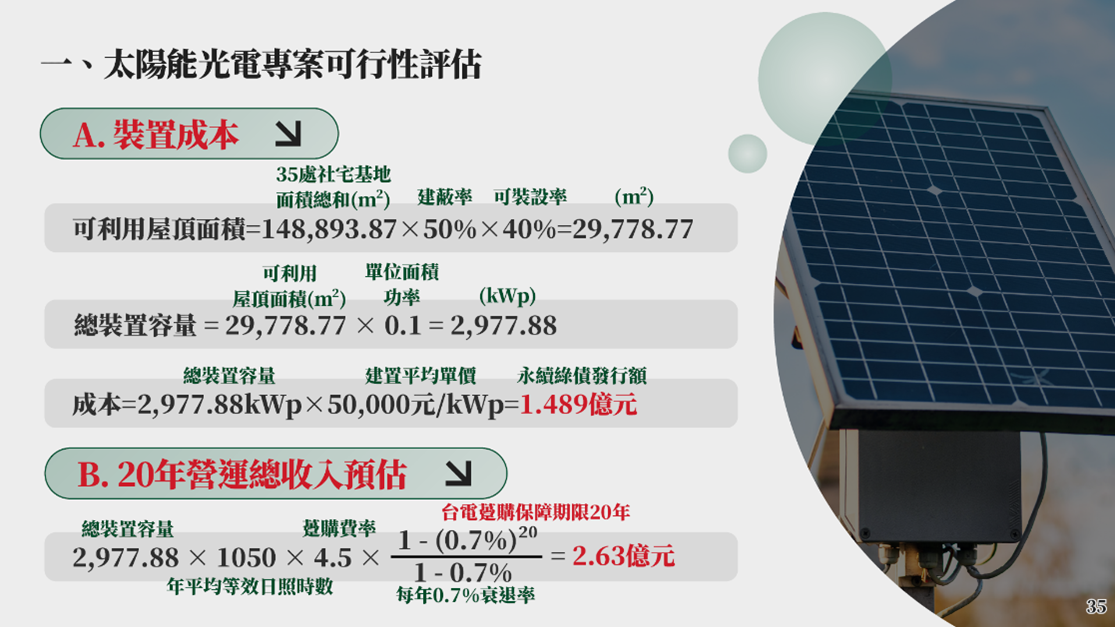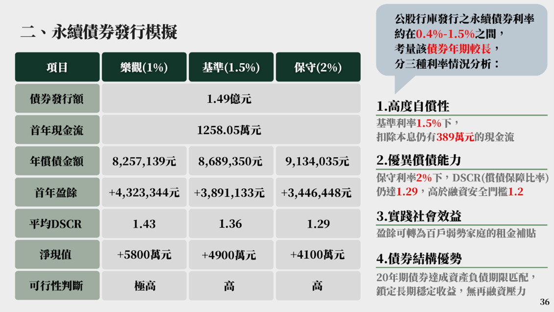 本專題借鏡了台北、高雄及桃園的經驗,提出了一個創新且具體的財務模型:由新北市政府發行「永續發展債券」。我們不只是紙上談兵,更具體鎖定「社會住宅結合屋頂太陽能光電」作為標的。透過精密的財務測算,我們證實了這項計畫具備高度的可行性——利用太陽能發電的收益來償還債券本息,不僅不會拖垮財政,還能創造穩定的現金流。